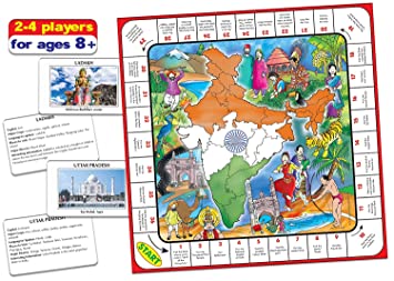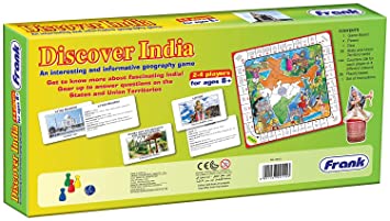DISCOVER INDIA is an interesting and informative geography game, which introduces children to the 36 States and Union Territories of India. They will learn things like the shape/location of the States/Union Territories, Its capital of Delhi, Major languages spoken around the nation, types of crops grown, the rivers, places to visit and other interesting information. Internalized learning includes: 1. Location of the States/Union Territories on the Map. 2. The visual memory of the States/Union Territories. (Picture on each card) 3. General knowledge-based information about the states. Children get to know facts and facets of their country while playing this game. DISCOVER INDIA’s unique board illustrates The Map of India, which aids in a child’s internalized learning. The box contains 1 Game Board, 4 Pawns, 1 Dice, 36 State and Union Territory Cards, 144 Counters bearing Names of States & Union Territories (36 for each player in 4 different colors) and 36 bases for the counters.