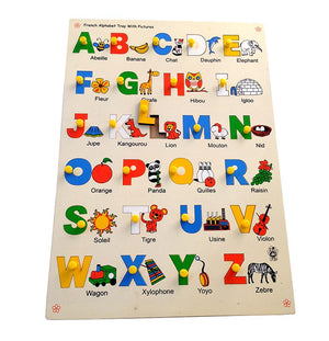 Learn French the fun way! The alphabets come out with the help of the knobs. The corresponding image is given alongside the alphabet. Identify the alphabet and the object that goes with it and place the alphabet in its correct place. This puzzle is self-corrective.