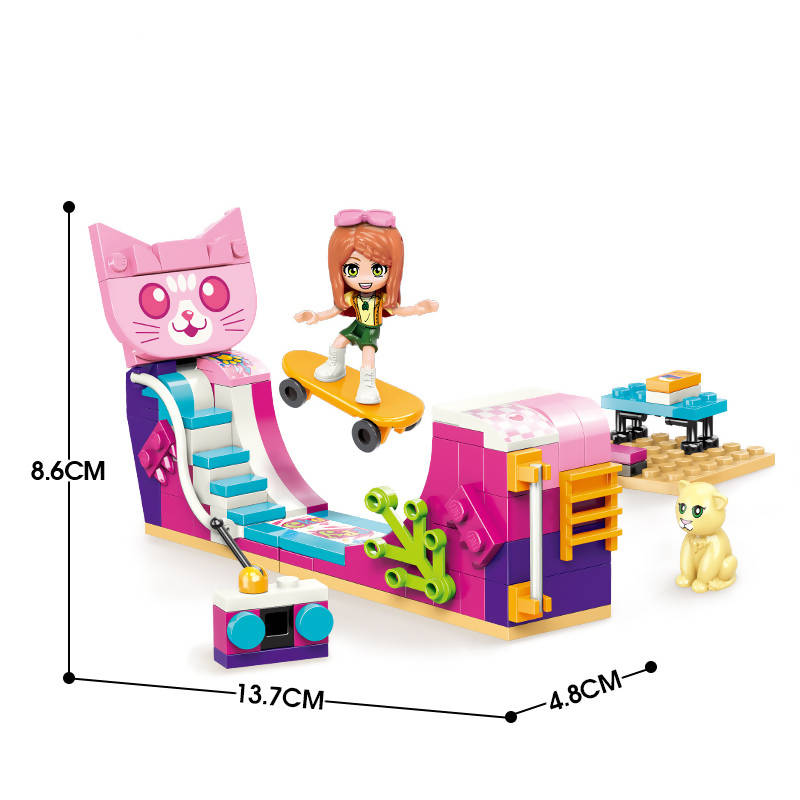 2 in 1 Kitty Skatepark Toy, Emily is confident and building a new skill of Skating. Emily become more confident. Very creative appearance design, Kitty , radio to play , cartoon pretty girl, these are the elements that girls love very much. The girls are not only happy play, but also full of beautiful imagination. High-quality Bricks-Every brick is screened and tested by professional machines, which greatly reduces the error rate of bricks and greatly improves the play experience. The bricks are closely connected to the bricks without feeling loose, have high quality. Vivid and Detailed Colorful Manual Book--The manual book has detailed color step diagrams. It has passed the test of many professional players. It is very detailed and easy to follow. Even a beginner will not make you feel difficult. Exquisite Packaging-The bricks are classified into a number of parts packages in detail, which will not make you feel messy. The well-designed packaging box will make you shine, suitable as a gift for your friends.