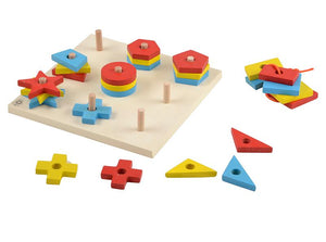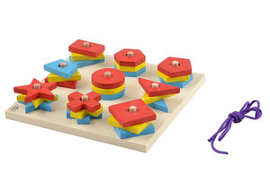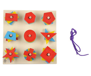 - This colorful board with pegs has 3 pieces each of 9 different geometric shapes in 3 different colors.