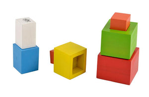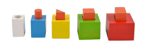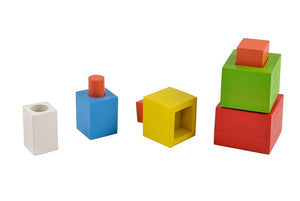 This shape sorter comes with five square blocks of of varying sizes, in five different colorsRecognize each colorUnderstand that each block is a different size (concept of small, big, bigger)Each square block has two cavities for shapes - one on top and the other at the bottomThere are four basic shapes rectangle, triangle, circle, and squareRecognize all the shapesNow comes the fun part! First, match the shape to the correct cavityOnce done, match the cavity of the bottom of the square block and place it on top of the shapeKeep at it till the whole tower is completeVery educative, challenging, yet fun! Teaches children colors, sizes and shapes while they improve hand & eye coordination, logical thinking and cognitive development