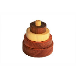 The Montessori inspired stacker has three discs, which help the child understand the concept of small, medium and large. Each disc is made of a different wood type in order to produce contrasting wood tones. This contrast emphasizes the order of the discs for the child.