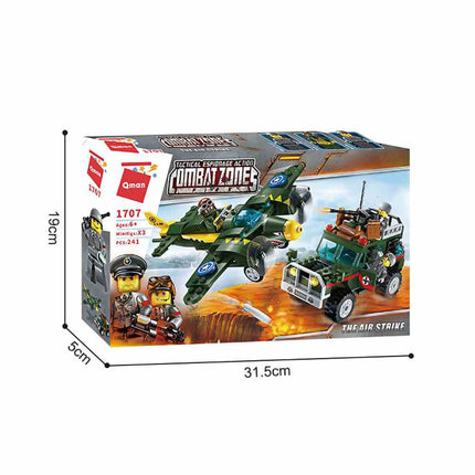 | Qman Brings “The Air Strike” of building blocks to enhance and stimulate the problem solving, imagination, self-expression, continuity, mathematics and permanence. The set is intricately designed for young hands, this plastic building block set adds unlimited excitement and fun to your young draftsman's play time. This set contains 241 pieces. Get ready for the Airstrike with armored vehicle. Fly a fighter plane and destroy enemy with laser cannon. Vehicle-mounted machine gun is positioned for the fight. It is an amazing set presented for your child. The brick are carefully-designed letting your children to expose to various skills and hand eye co-ordination. So don’t wait and Get ready for the Airstrike with armored vehicle. Get ready for full-fledged obsession with these structuring blocks set. |