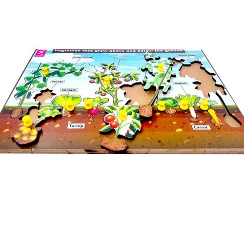 We all know that different vegetables grow differently. Some grow below the soil, some grow above the surface and few vegetables grow on vines. A unique way to teach kids about different kinds of vegetables and from where they are grown. Common Kids lets go through this journey and learn about vegetables. Size of tray-311*225 mm SPECIAL FEATURES: Kids develop problem solving skills and learn about vegetables in unique way Promotes hand-eye coordination, fine motor skills, critical thinking and problem-solving skills, visual senses, and kinetics awareness Kids have to place the cut out pieces into their respective places in the wooden puzzle tray Made in India: This product has been carefully made in India.