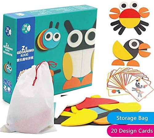 1.Geo animo Wooden Blocks is a 29 wooden geometric shape set which you can arrange to make creative and fun shapes. It fuels kids imagination. Perfect toy for developing imagination and learning shapes and colors. 2.It comes in a sturdy cardboard box with 21 cards for design inspiration. With this toy puzzle infants learn to recognize geometric shapes and create new figures. The beginning of a tangram!