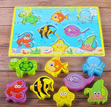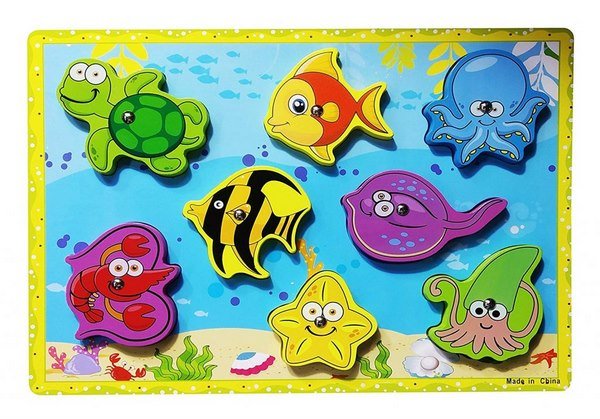 Fish and fishing rod with built-in magnet in the center, making kids quickly catch on to how to pick up the fish with the poles. The wooden magnetic fishing game is a great gift for children from 2 to 3 years old.This Wooden Fishing Game is a puzzle-game combination, made with sturdy wooden pieces.Benefits of Playing: Exercising patience for children, introducing various types of sea animals to children, color recognition, training fine motor skills of children.